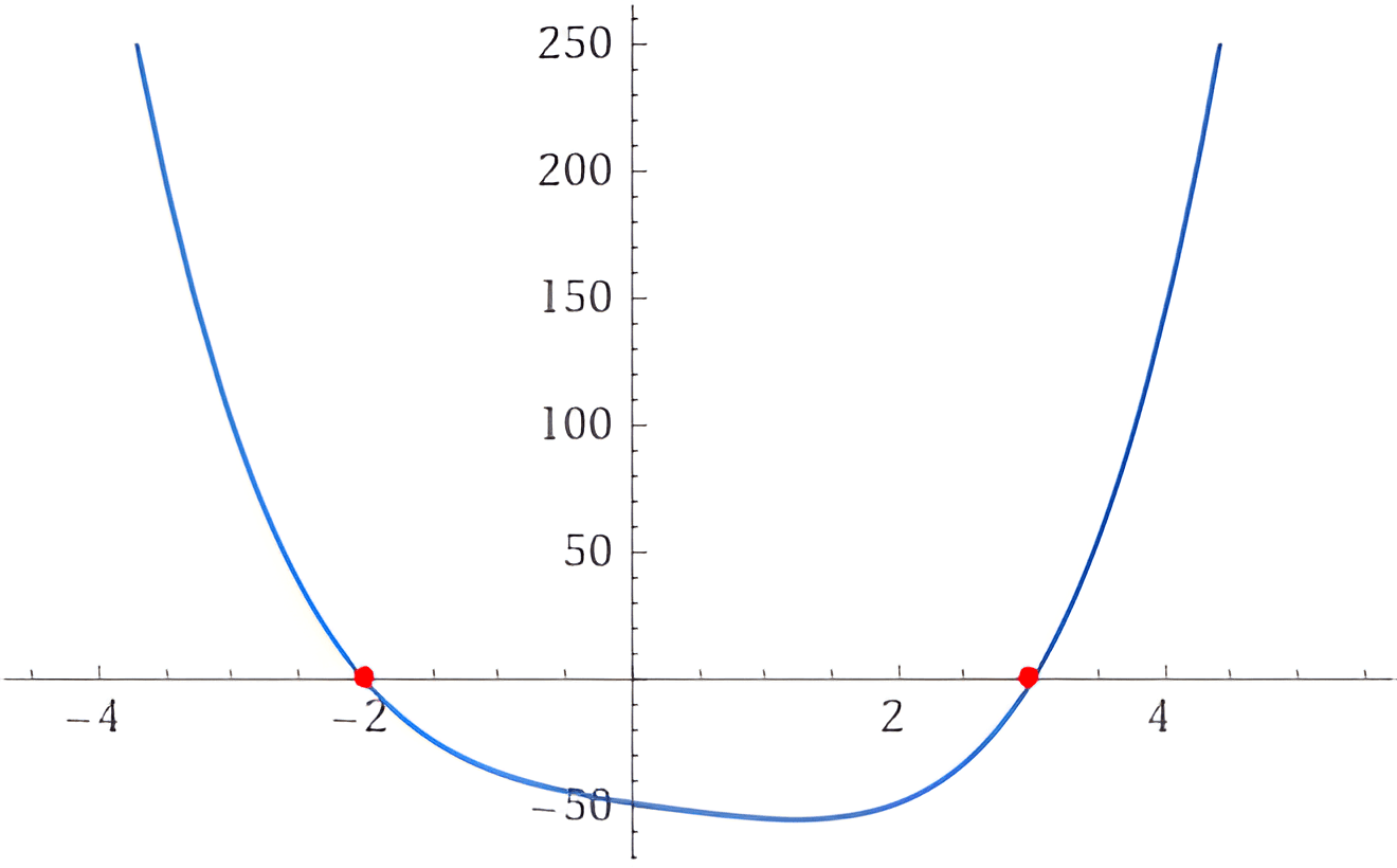 We have found two rational zeros: x=2x = -2 and x=3x = 3