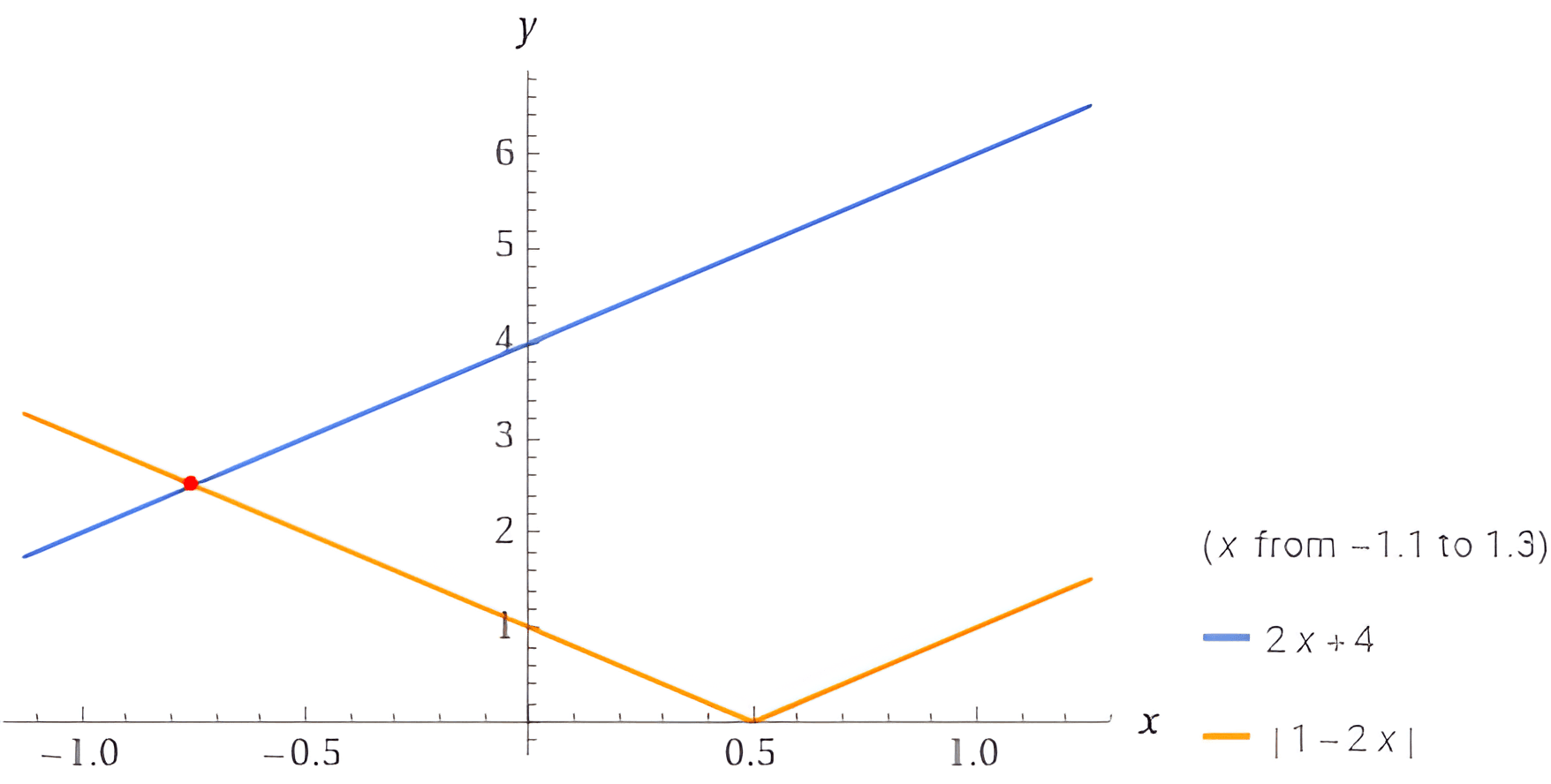 For the second case, 2x+4=−2x+1, solving this gives 4x=−3 or x=−3/4. Substituting x=−3/4 into y=2x+4 gives y=5/2