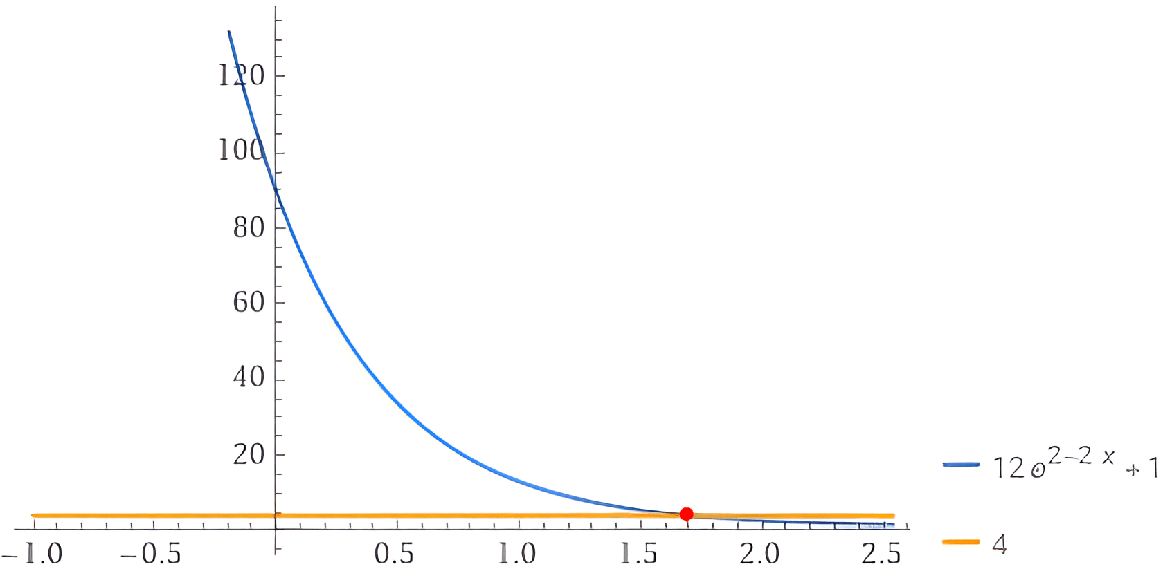 Apply the natural logarithm to both sides to solve for x: 2−2x=ln(41)