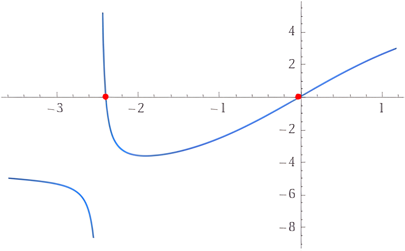 The real zeros of h are approximately x≈−2.3947 and x≈−0.023257.