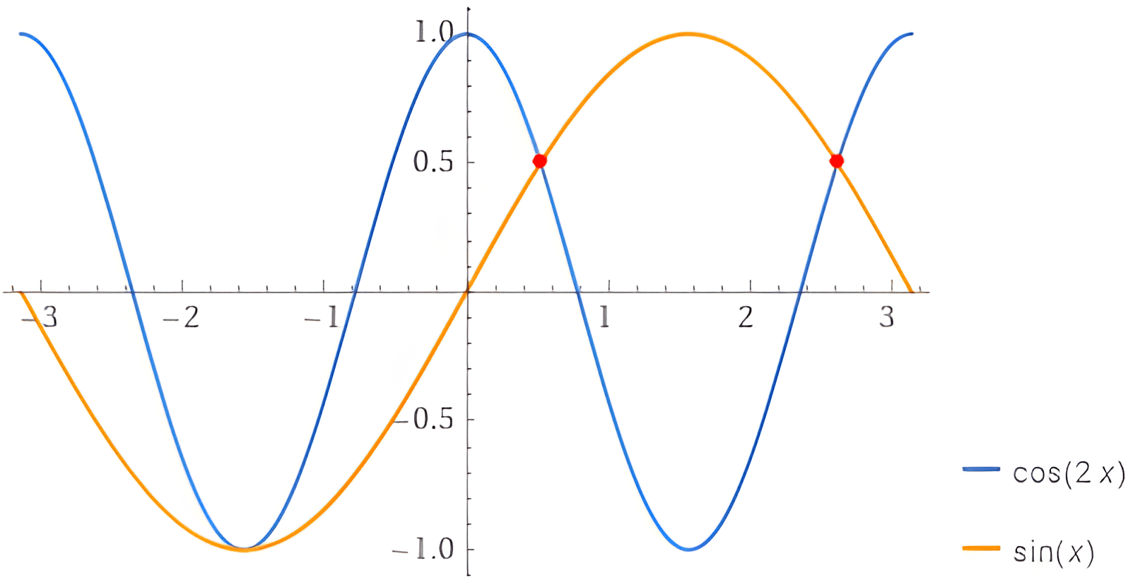 The solutions to the equation cos2x=sinx in the interval [−pi,pi] are x=fracpi6,frac5pi6,−fracpi2.