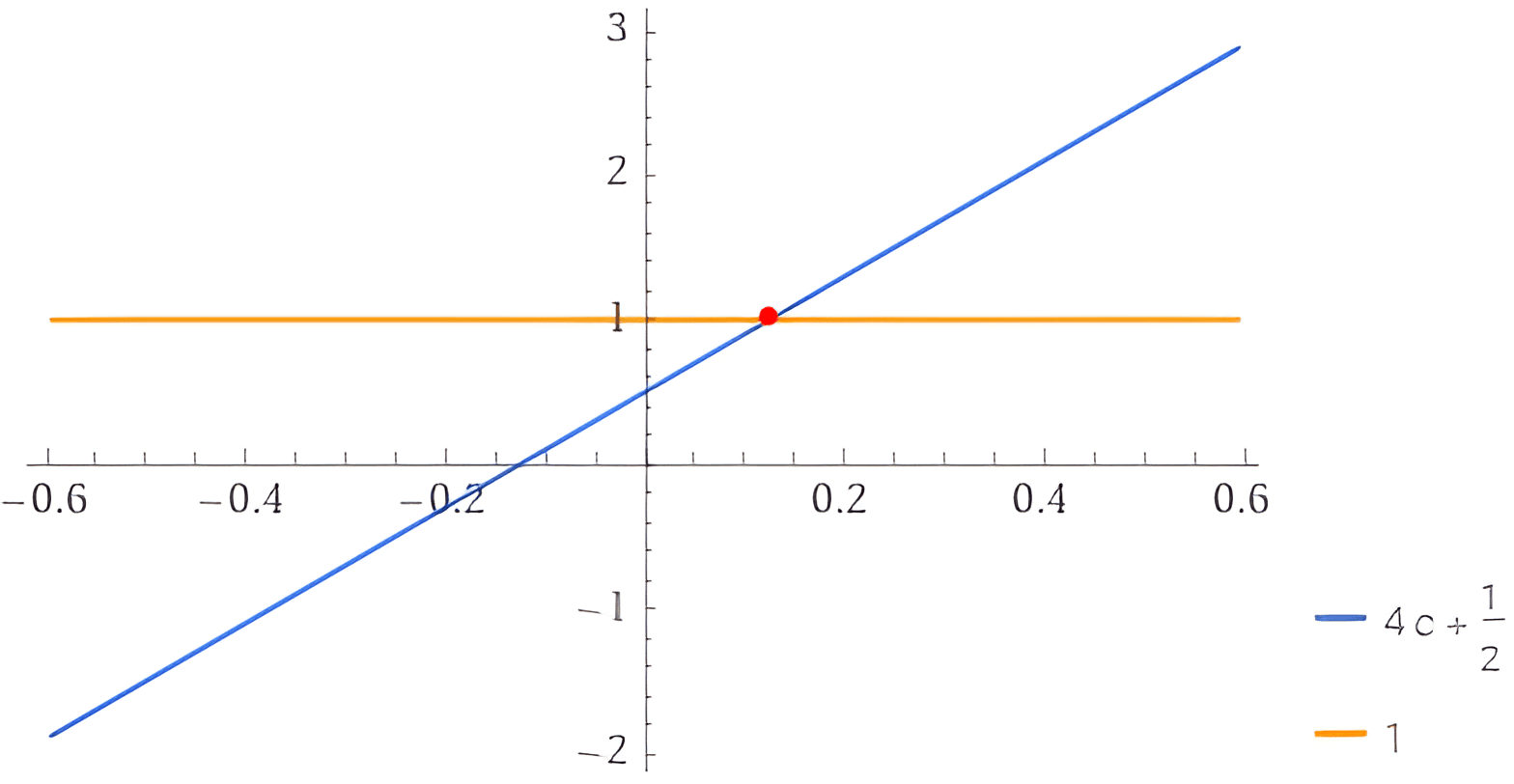 Solving for c c : Rearranging the equation 4c+12=1 4c + \frac{1}{2} = 1 gives 4c=112=12 4c = 1 - \frac{1}{2} = \frac{1}{2} , leading to c=18 c = \frac{1}{8}