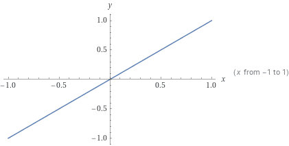 The graph is a straight line passing through the origin with a slope of 1, within the interval [−1,1].