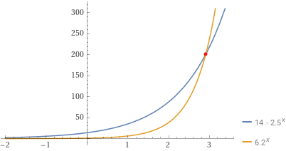 Set the two expressions equal to each other to solve for x x : 142.5x=6.2x 14 \cdot 2.5^x = 6.2^x