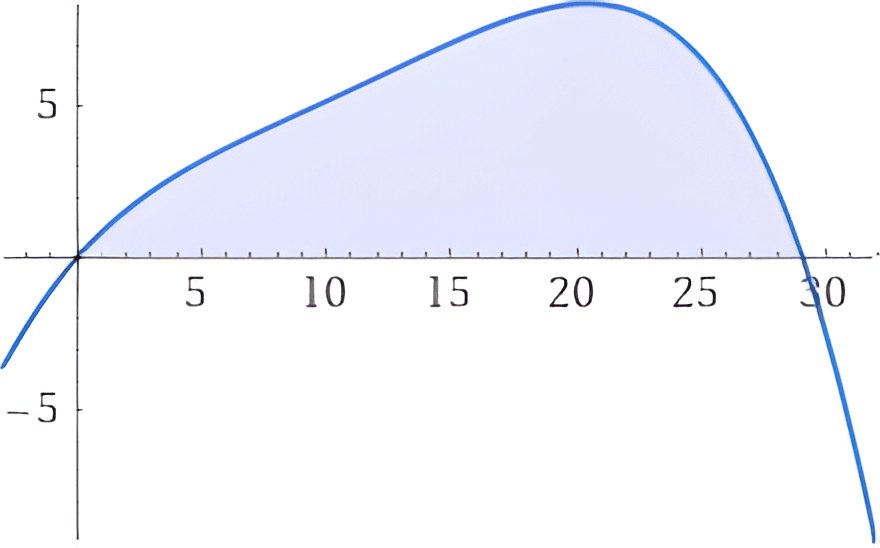 The area under the curve from x=0 to x=29.08941 is approximately 155.184